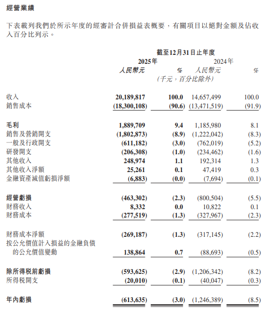 毛利及毛利率方面,公司于2025年录得毛利东说念主民币18.897亿元,而2024年的毛利为东说念主民币11.86亿元。2025年的毛利率为9.4%,而2024年则为8.1%,同比飞腾1.3%。公司于2025年的毛利率比较2024年有所擢升,主如果因为公司的收入增幅进步了销售资本的增幅。这归因于曹操大脑赋能出行处事的运营效果完了擢升,其优化供需匹配,使补贴披发及营销推广更高效,同期镌汰车辆销售业务的采购资本。